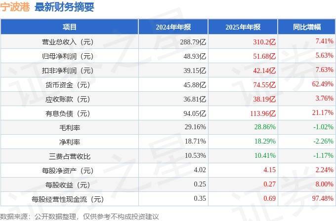 据证券之星公开数据整理,近期宁波港(601018)发布2025年年报。截至本报告期末,公司营业总收入310.2亿元,同比上升7.41%,归母净利润51.68亿元,同比上升5.63%。按单季度数据看,第四季度营业总收入81.38亿元,同比上升15.93%,第四季度归母净利润12.94亿元,同比上升63.55%。本报告期宁波港公司应收账款体量较大,当期应收账款占最新年报归母净利润比达73.9%。